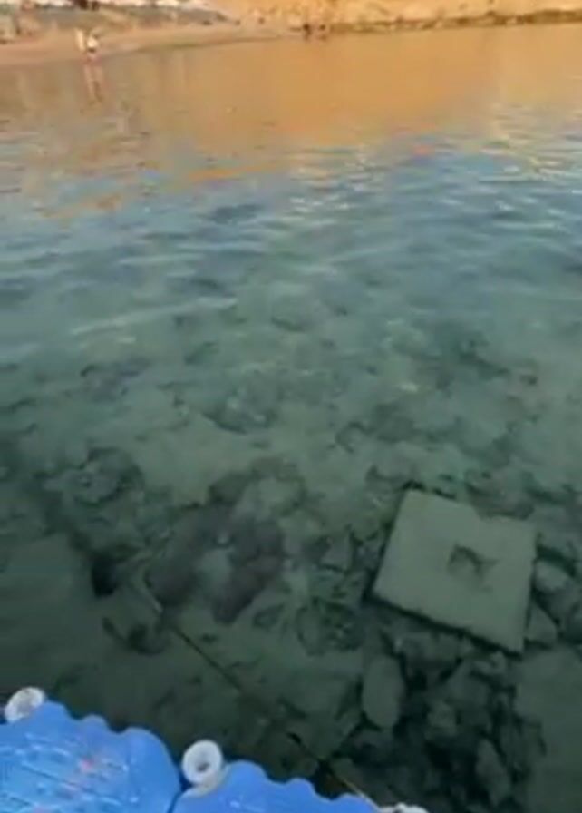 view of the sea from a blue dock or walkway, with a shallow, sandy seabed visible underwater. The water is clear enough to see various rocks, debris, and a large, square concrete slab lying on the bottom. The slab has a hole in the center. A dark fish swims slowly near the concrete slab. In the background, a sandy beach is visible with a cliff-like structure. A couple of buildings and some palm trees are on top of the cliff. The light indicates it is early morning or late afternoon, with a golden hue on the beach and buildings. The camera moves slightly. The overall impression is of a peaceful and calm scene.