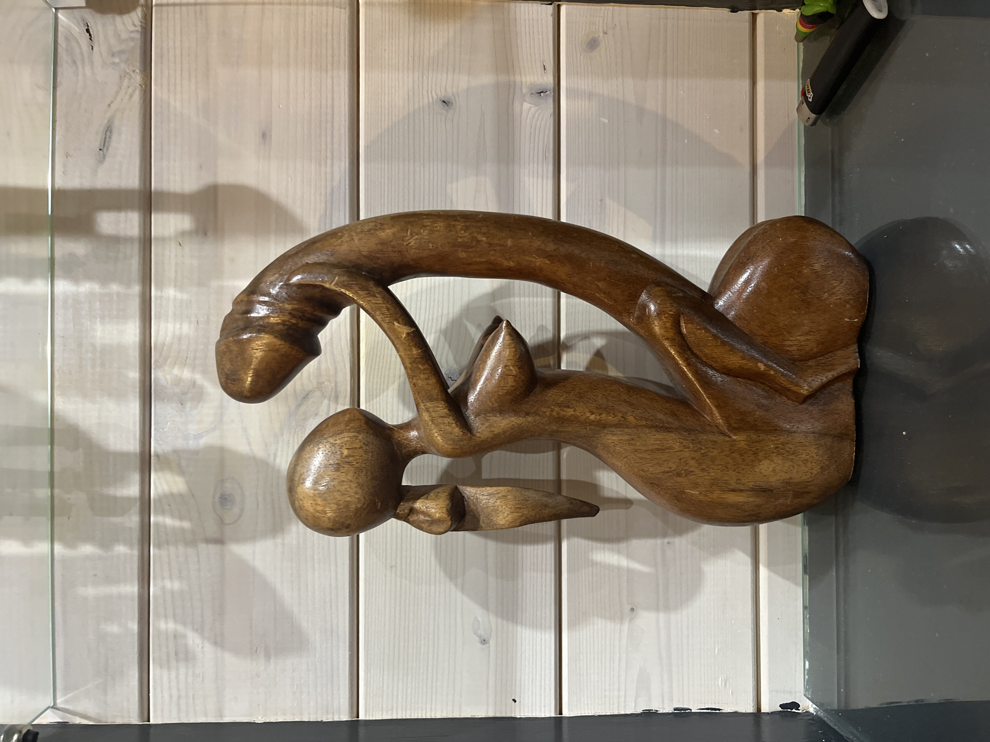 A wooden sculpture of a sexual nature is placed against a light-colored wooden wall in what appears to be a domestic setting