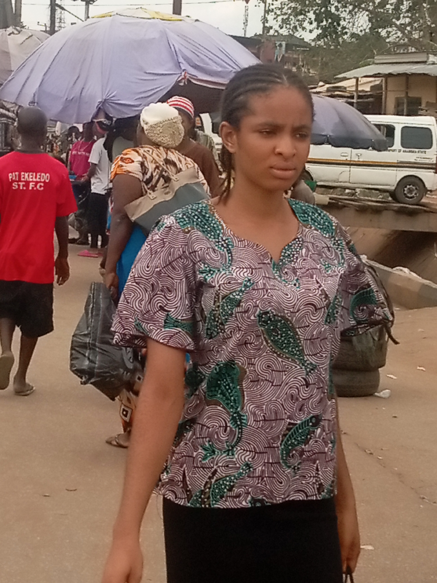 The image captures a street scene in Onitsha, Nigeria. A young woman with braided hair stands in the foreground, wearing a patterned blouse and a black skirt. Behind her, people mill about, some gathered under a large, light-colored umbrella that appears to be part of a market stall. A man in a red shirt with the text "PAT EKELEDO ST. F.C" walks to the left. In the background, a white van with markings indicating it belongs to the government of Anambra State is visible. The street surface is unpaved and dusty. The scene is likely a bustling marketplace or commercial area.