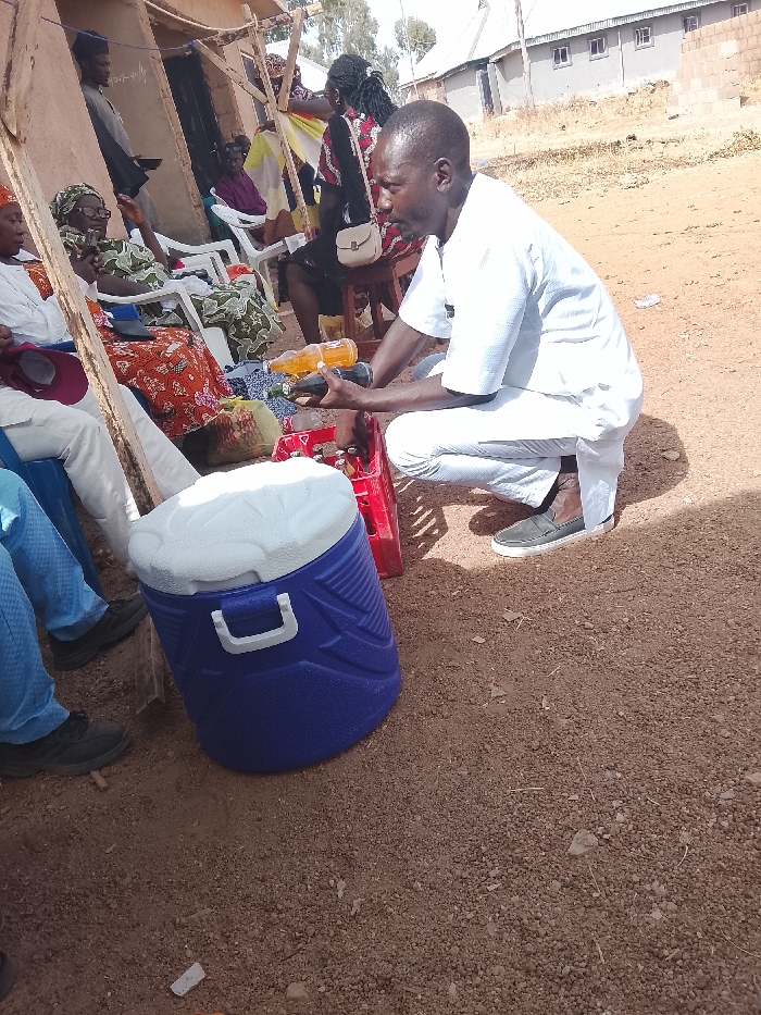 A man wearing a light-colored outfit is crouching down, appearing to take a beverage from a red crate filled with drinks. Beside him is a large, blue and white cooler. The scene appears to be outdoors, possibly at an event, with other people seated in the background under a makeshift shelter. The ground is dirt or gravel.