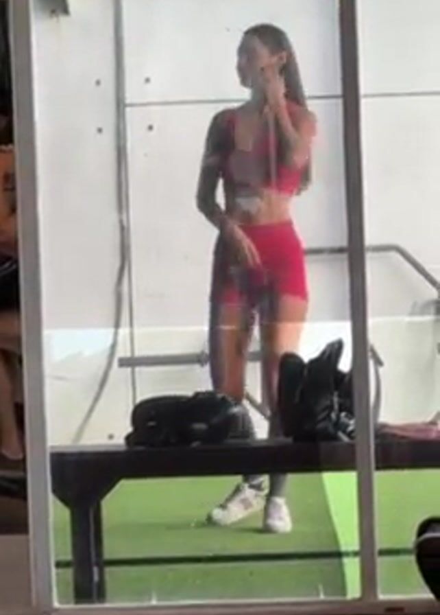 A medium shot depicts a young woman in a gym, as seen through a glass partition. She is dressed in a red sports bra and matching shorts, wearing white sneakers and grey socks. She appears to be adjusting her hair and briefly touches her chest while looking around the gym. On a wooden bench in front of her, several items are placed, including a black duffel bag and a pair of black boxing gloves. The flooring inside the partitioned area consists of green artificial turf. Outside of the partition, another person is partially visible, seated and holding a black handbag. The gym setting includes visible exercise equipment and a staircase in the background.