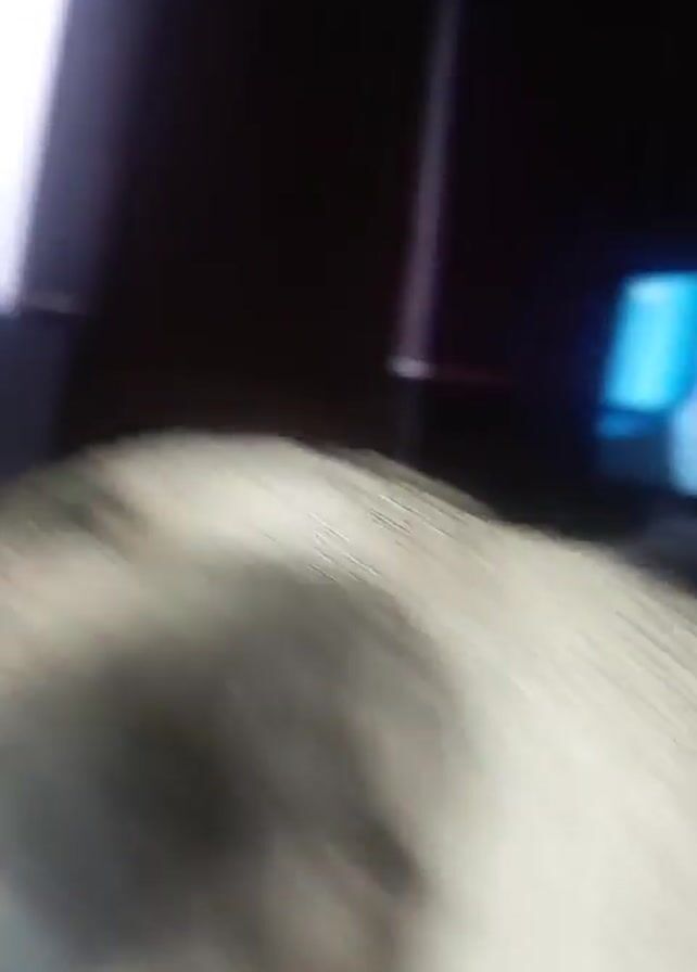 A short video shows a person holding a fawn pug on a patterned blanket. A television in the background plays a scene with a woman. The pug appears to be resting or sleeping on the blanket. The person gently pets the pug on the head. The room has a window with a maroon curtain. The floor appears to be tiled.