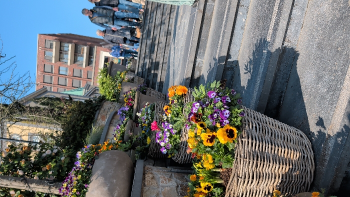The image depicts an outdoor urban scene in Roermond, Netherlands, featuring a prominent set of dark grey stone steps ascending diagonally from the lower left to the upper right. The left side of the steps is lined with a tiered arrangement of large, round grey planters and various wicker baskets. These containers are densely filled with a variety of flowering plants, primarily pansies displaying yellow, purple, and variegated petals, alongside some orange, pink, and white blossoms, and yellow daffodils. Behind these floral displays, stone retaining walls are visible, topped with green foliage and a climbing plant with light-colored flowers. In the mid-ground, a pale yellow building with dark windows is partially visible on the left, adjacent to a dark green pointed spire. Further into the background, a multi-story modern brick building with dark windows and visible balconies dominates the upper right quadrant, set against a clear, light blue sky. Approximately six individuals are observed on the upper portion of the steps and a landing, walking towards the background. These pedestrians appear to be adults, dressed in casual outerwear such as jackets and jeans. One man in a grey vest and blue jeans is prominently visible within the group. The scene is illuminated by direct sunlight, casting distinct shadows of planters and unseen elements onto the stone steps.