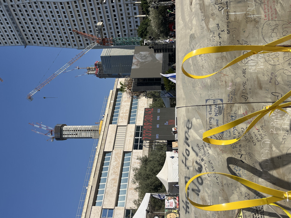 The image displays a daytime scene in Hostages Square, Tel Aviv, Israel, under a clear blue sky