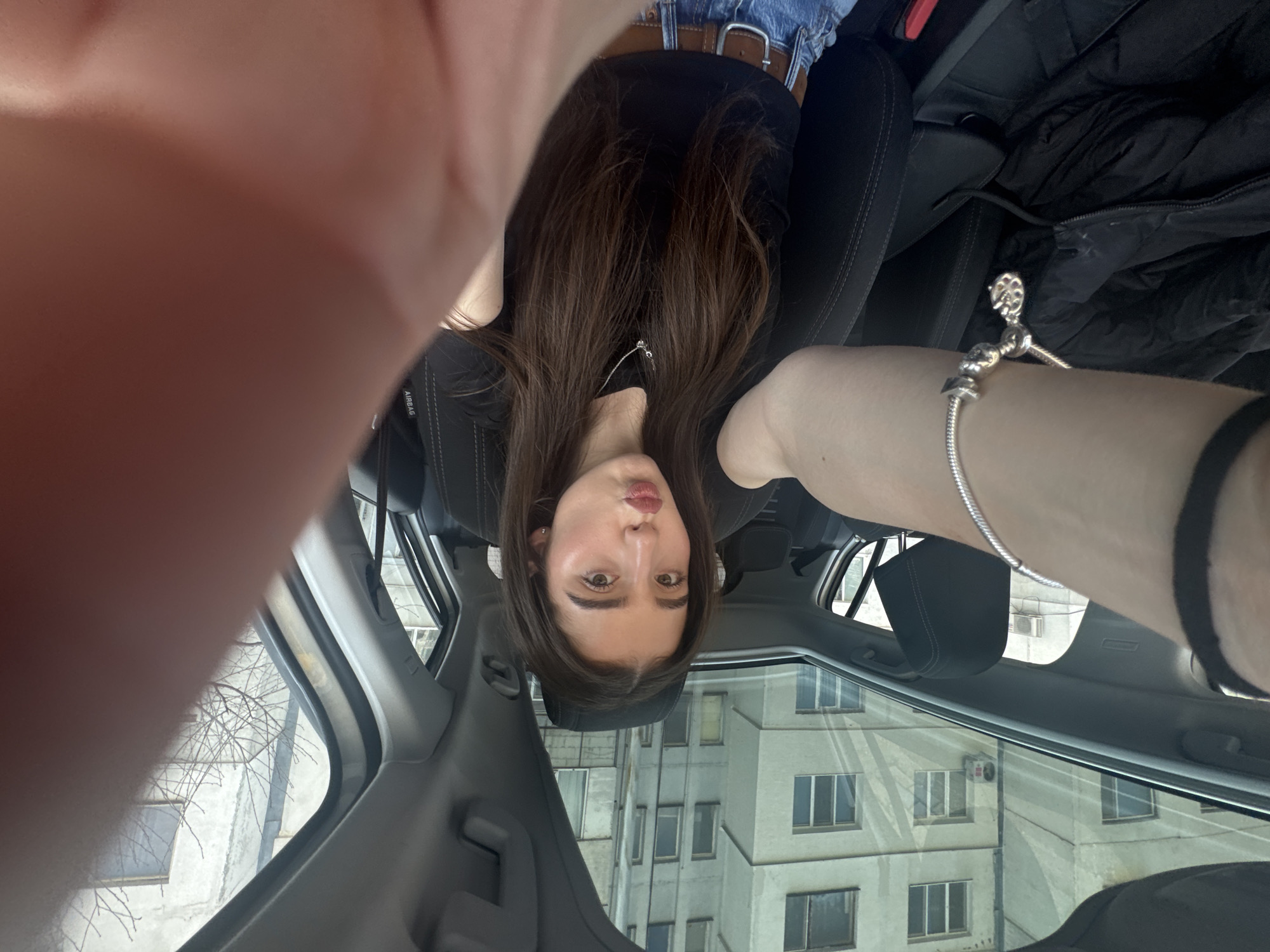 The image displays a tilted, high-angle selfie taken inside a vehicle. A young adult female is the primary subject, positioned in the central and lower-right portions of the frame, with her head oriented towards the right. She has long, dark brown hair, fair skin, light brown eyes, and is making a "duck face" expression with puckered lips. She wears a dark shirt, a silver-colored necklace with a small charm, and light blue jeans with a brown belt. Her left arm, adorned with a silver-colored charm bracelet, extends towards the camera, with parts of her fingers obscuring the upper-right corner of the frame. The vehicle's interior features dark upholstery, including a headrest marked "AIRBAG" and a dark, crumpled jacket on a seat or floor in the lower-right. Through the car's windows and sunroof (visible on the left and upper-left), an external urban environment is reflected. A multi-story, light-colored building with numerous dark rectangular windows is prominent, with one window showing an exterior air conditioning unit. Bare tree branches are visible against an overcast sky through the sunroof. The location is in the city of Unknown, Unknown.