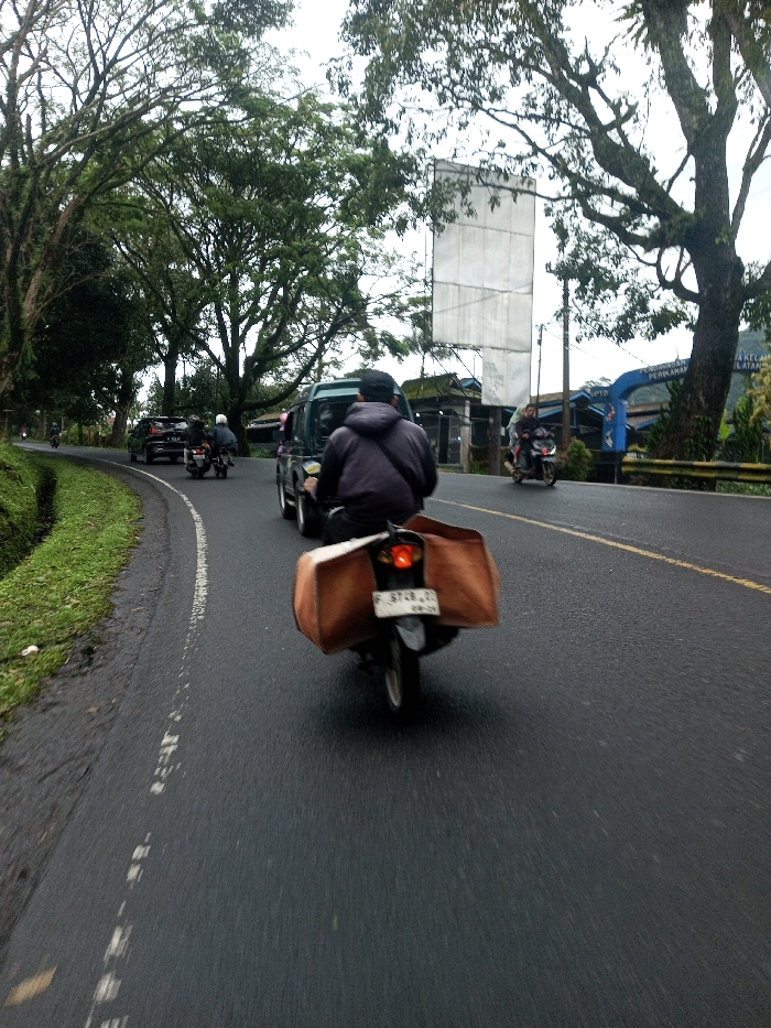 The image depicts a multi-vehicle road scene under an overcast sky, viewed from the perspective of a following vehicle, on what appears to be a two-lane asphalt road with a slight left curve. The road is flanked by lush green vegetation and large trees, some forming a canopy overhead. In the immediate foreground, the rear of a motorcycle is visible, ridden by an individual wearing a dark hooded jacket and a dark cap. The motorcycle carries large, light-brown, canvas-like panniers or bags on either side of its rear wheel. Its license plate, "F 6748 CO" with "08-29" below, is clearly visible, indicating an Indonesian registration (region 'F' covers areas like Bogor, Sukabumi, and Cianjur). Ahead of this motorcycle, a dark green Suzuki Jimny-like utility vehicle is in motion, followed by another motorcycle with a rider in a white helmet. Further down the road on the left, a dark sedan or hatchback is visible, trailing the second motorcycle. All these vehicles are traveling in the same direction. On the opposite side of the road, approaching the viewer, a motorcycle carries two individuals. The driver wears a dark jacket, and a passenger is seated behind. The road features a broken white line on the left edge, separating the paved surface from the grassy verge, and a solid yellow line delineating the edge of the opposing lane. The asphalt appears damp. To the right of the road, a tall, blank white billboard structure stands prominently. Beyond it, a blue archway with visible Indonesian text, including "PERJALANAN" (Journey/Travel) and "PELAYANAN" (Service), marks what appears to be an entrance or landmark. Other buildings and structures are discernible in the background. The visible textual information (Indonesian language on signs, Indonesian 'F' license plate) strongly suggests the location is in Indonesia, not Serpang Shalli, Bhutan, as specified.