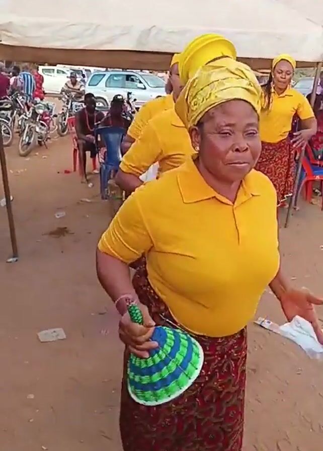 group of middle-aged African women dancing at an outdoor event. All are wearing matching yellow tops and head wraps, and printed reddish-brown skirts. One woman in the foreground is holding a fan and a white cloth. The women are standing on bare dirt. In the background, there is a white tent, chairs, vehicles, and other people sitting and standing around. The video appears to be shot from the perspective of someone participating in the dance. The sound of music and singing can be heard.