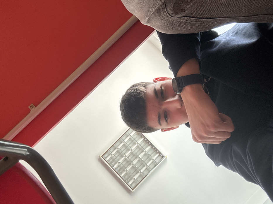 The scene is an indoor environment in Zlatograd, Bulgaria. A young male subject, with short dark hair, is positioned in the foreground, looking directly into the camera from a low angle. He wears a dark-colored hooded garment. A black wristwatch is present on his right wrist, which is raised with the hand partially obscuring the lower portion of his face. A segment of light brown trousers is visible on the right side of the frame. The background consists of a white ceiling on the left, featuring a rectangular fluorescent light fixture with a grid diffuser. Diagonally to the upper right, a red wall or ceiling section is visible, separated from the white surface. A light-colored conduit or trim is affixed to the red surface with a visible screw. A dark grey curved metal bar is present in the upper left corner.