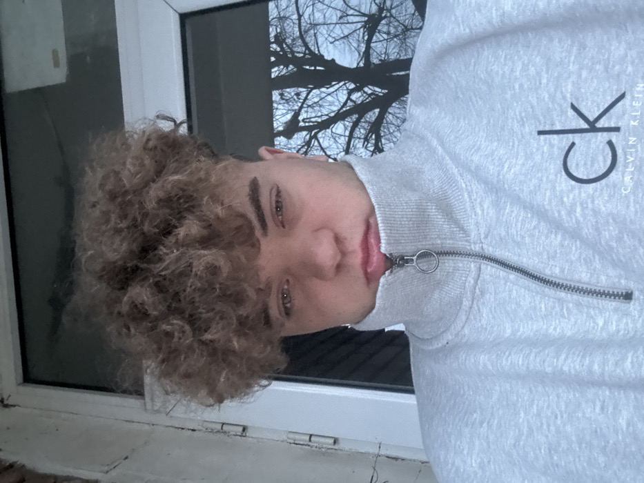 A male subject is depicted in a close-up, frontal portrait. He possesses medium brown, tightly curled hair, a short fade on the sides, and light-colored irises. His lips are slightly compressed. He is wearing a light grey, ribbed half-zip sweatshirt featuring a high collar and a circular silver-colored zipper pull. The "ck CALVIN KLEIN" logo is visible in black text on the lower right chest area of the garment. To the subject's left, a portion of a white or light-colored, possibly textured, frame structure is visible. To the subject's right, an outdoor scene is visible through a glass pane, featuring the silhouette of a bare deciduous tree with numerous branches against a bright, overcast sky. The image provides no specific visual cues to identify a precise location within the city of Vratsa, Bulgaria.