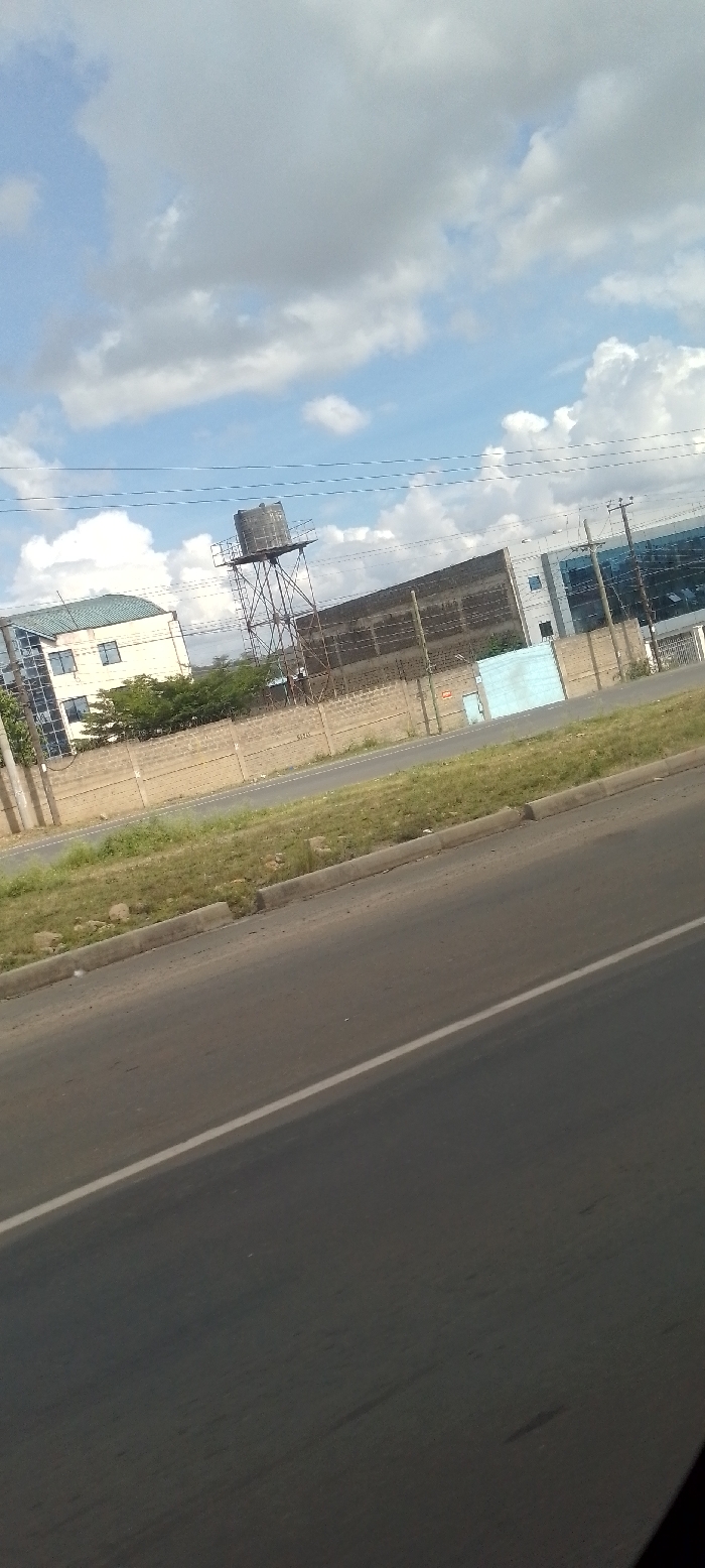 The scene depicts an outdoor environment in Matathani ward, Kenya, captured from a slightly elevated perspective, possibly from a moving vehicle. In the foreground, a dark asphalt road with a single white lane marking runs diagonally from the lower left to the right. This road is bordered by a raised concrete curb, separating it from a narrow, unkempt median strip covered in sparse green and brown grass and exposed soil. In the midground, beyond the median, another asphalt surface is visible, running parallel to the foreground road. Behind this, a light-colored concrete block perimeter wall, displaying some faint markings including "5T70," extends horizontally across the frame. Several dark-colored utility poles, supporting multiple overhead power lines and cables, are positioned behind and above this wall. The background features multiple structures under a sky characterized by a mix of blue and large, white to gray cumulus clouds. To the left, a multi-story building with a light facade and a distinctive green, ridged roof is visible, partially obscured by trees. Centrally located is a tall, dark-colored metallic water tower with a cylindrical tank atop an open lattice support structure. To the right of the water tower, a large, dark, possibly industrial building stands next to a modern multi-story structure featuring a predominantly blue-tinted glass facade with white structural elements. A light blue, possibly metal, gate or wall section is present in front of the darker building. No individuals or specific actions are discernible within the frame.
