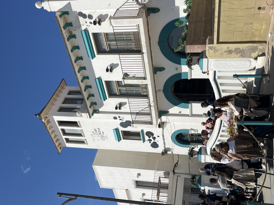 The scene is a street-level view of a restaurant in Alboraia, Spain. The restaurant is located on a corner lot and has a white facade with teal accents. There is a group of 12 people seated at a table in front of the restaurant, enjoying drinks and conversation. The tables and chairs are made of metal and wood, and the table is decorated with a small bouquet of flowers. There are potted plants and flowers decorating the front of the restaurant. The restaurant is called "La Chipirona" and has a sign that reads "Casa de Tapas." The sky is clear and blue.