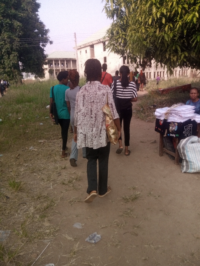 A group of people walk on a dirt path. The person closest to the camera wears black pants and a white patterned blouse. A vendor sits behind a table selling merchandise on the right. In the background, a dilapidated building is visible. Trees are on both sides of the path. Trash is scattered on the ground in the foreground.