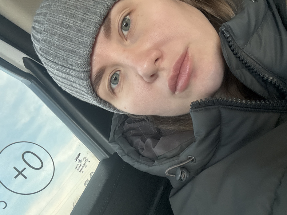 A female individual is depicted in a close-up, self-portrait style, seated within a vehicle. She wears a grey ribbed knit beanie and a dark grey or black puffer jacket with a visible zipper and an adjustable hood featuring a drawstring. Her facial features include light-colored eyes, light brown eyebrows, and naturally colored lips. Her gaze is directed towards the camera. The vehicle's dark interior trim is visible, along with a side window in the upper left portion of the frame. Through the window, an overcast or hazy sky and indistinct ground features are visible, consistent with an outdoor, potentially cold environment. A circular white sticker displaying "+0" is affixed to the window. Reversed text, possibly from the vehicle's glass etching or a sticker viewed from the interior, includes "JAVAH" (Haval), "0AЯUT", and "B010-02A", indicating the vehicle is likely a Haval brand. The image provides no specific landmarks or distinguishing environmental details to precisely identify a location within the city of Zamulyanka, Russia, beyond the general setting within a vehicle.