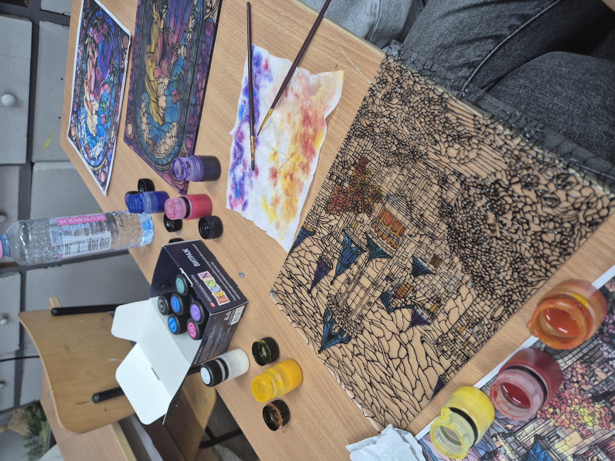 tabletop cluttered with various art supplies, suggesting an artistic workspace. The items include two stained-glass-style artworks, one of which is a partly finished city scene. Several bottles of paints in various colors (purple, blue, red, yellow, orange, and white) are scattered around, alongside a box of "DECOLA ВИТРАЖ" brand acrylic paints for glass. A water bottle is also present. Two paintbrushes rest on a multicolored, stained paper towel. The scene appears to be in a room, possibly a home studio or workshop, but the location in Pavlikeni, Bulgaria, cannot be ascertained from the visual information. A person's lap, clad in denim jeans, is visible in the upper right corner of the image.