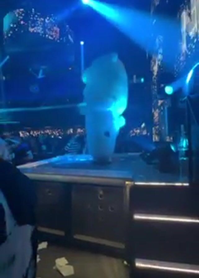 nightclub with a stage where a person in an inflatable white mushroom costume is standing. The stage is lit with blue spotlights. The club is crowded with people. The camera is positioned near the stage, and someone wearing a patterned black-and-white shirt is partially visible in the foreground. There are some white tissues on the floor.