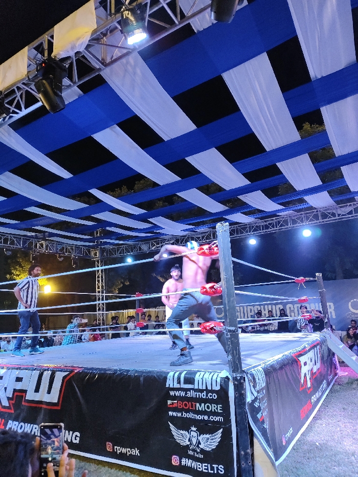- "The image portrays an outdoor professional wrestling event held at night, likely within an open-air venue in the Rawalpindi/Islamabad region of Pakistan, as indicated by the "Rawalpindi Pro Wrestling" (RPW) branding on the ring apron" by FM-uPtwu2, licensed under CC BY 4.0