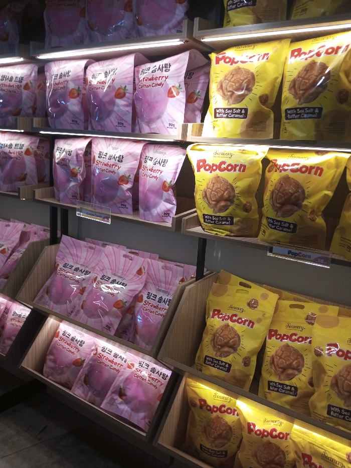 This image captures a static, eye-level view of retail display shelving inside a store located in Tân Kỳ Commune, Vietnam. The multi-tiered display unit is constructed from light-colored wood and dark metal supports, illuminated by linear LED lighting strips positioned beneath each shelf. The shelves are stocked with packaged snack foods. On the left side of the frame, several rows of pink stand-up pouches, labeled "chocomory Strawberry Cotton Candy" with accompanying Korean text ("핑크 솜사탕") and a stated weight of 70g, are neatly arranged both upright on shelves and within wooden display bins. Concurrently, on the right side, multiple rows of bright yellow stand-up pouches are displayed, identified as "chocomory Popcorn with Sea Salt & Butter Caramel." No individuals, active interactions, or movements are present in the scene.