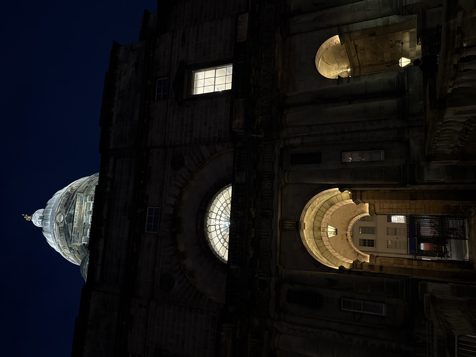 A dimly lit architectural scene presents a large, stone building at night. A dome with ornate detailing is illuminated against a dark blue sky. The building's facade is visible, featuring various windows, including a large, circular one with intricate patterns, and arched doorways. Light emanates from within the building and the adjacent street, casting shadows and highlighting the stone texture. The orientation of the building is slightly skewed, as if viewed from below.