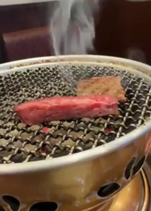 - "In a close-up shot, slices of raw red meat are placed onto a small circular grill with a gold-colored base" by FM-RAq1Q2, licensed under CC BY 4.0