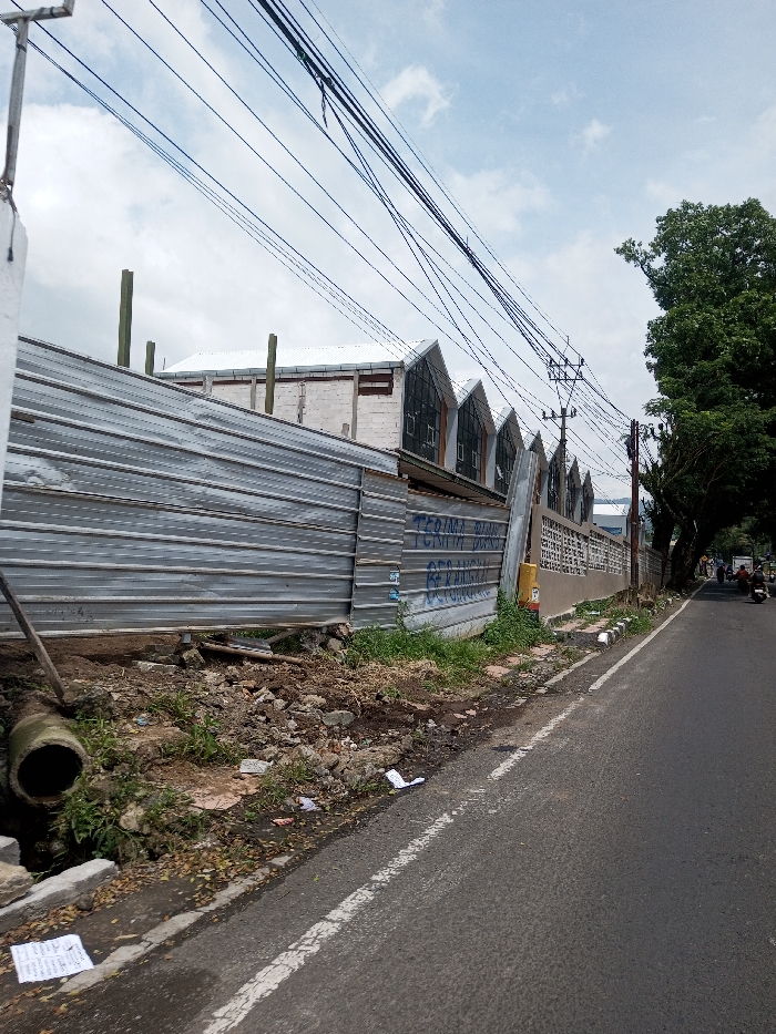 The scene depicts an outdoor urban environment in Khajuripada, India, on a clear day with scattered clouds. A two-lane asphalt road runs from the mid-right foreground into the background, with a solid white line marking its right edge. To the left of the road, a narrow dirt shoulder separates it from a temporary construction barrier made of corrugated metal panels. This barrier is partially covered in graffiti, including blue text reading "TERIMA DONAS... GERBANG..." on its right section. Behind the barrier, a building with a light-colored facade is visible, topped by a series of three prominent, dark-roofed structures featuring sharply gabled roofs with vertical elements. Several wooden posts extend vertically from behind the barrier, suggesting ongoing construction or renovation. Further to the left foreground, a concrete drainage pipe opens into a channel obscured by dirt and sparse vegetation. The ground between the road and the barrier is uneven, covered in dirt, rocks, grass, and scattered litter including discarded papers. Above the buildings, numerous dark utility cables crisscross the sky, supported by a wooden utility pole with multiple cross-arms positioned along the roadside. To the right of the road, a low concrete curb separates it from a light-colored concrete block wall with a decorative open pattern, behind which mature trees with dense green foliage line the street. In the distant background on the road, two individuals on motorcycles are observed traveling away from the viewer.