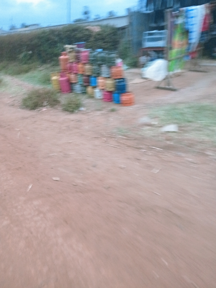 This image depicts an outdoor scene in Lumakanda ward, Kenya. The foreground consists of an unpaved, reddish-brown dirt surface, likely a path or ground area, with small patches of green vegetation on the left. In the midground, a large quantity of domestic gas cylinders, varying in size and color (including pink, yellow, blue, orange, and green), are stacked in multiple piles on a patch of grass. Behind these cylinders, a dense line of green foliage forms a visual barrier, with a blurred elevated structure, possibly a road or bridge, visible above it. To the right of the stacked cylinders, indistinct structures, potentially commercial buildings or stalls, are present. A wooden frame or stand draped with colorful fabrics or tarps is also visible in this area, along with a white, amorphous object near its base. The sky is overcast. No individuals are discernible within the frame. The scene represents an outdoor storage or retail point for liquefied petroleum gas cylinders.
