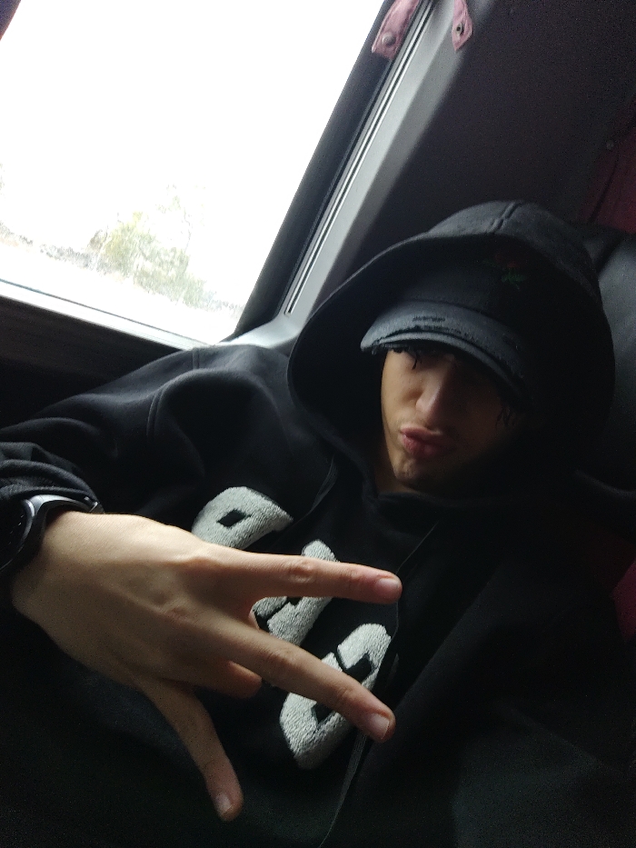 An individual is depicted seated inside what appears to be a vehicle, possibly a bus or car, next to a window