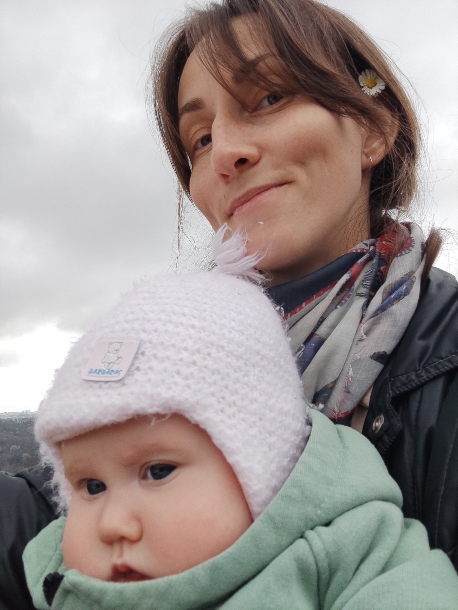 A close-up, chest-up selfie depicts an adult female holding an infant outdoors in Bestuzhevskoye, Russia, under an overcast sky with a blurred distant city visible in the background. The adult female, positioned in the upper portion of the frame, has brown hair styled with bangs, light freckles on her nose and cheeks, and a faint smile. A small white daisy with a yellow center is tucked into her hair above her right ear, which also bears a small silver hoop earring. She wears a dark jacket, possibly black, and a multi-colored scarf featuring grey, black, red, and blue patterns around her neck. The infant, held by the female in a front-carry position, occupies the lower portion of the frame. The infant has light skin, blue eyes, and a neutral expression, looking slightly to the left. The infant wears a light pink knitted hat with a white rectangular label featuring a blue teddy bear illustration and the text "BARRABAS" visible. A light green hooded garment, likely a jacket or hoodie, covers the infant's body. The background consists primarily of a uniformly light grey, overcast sky. In the lower-left corner, a blurred landscape shows distant urban structures and patches of vegetation on elevated terrain, consistent with a city overview.