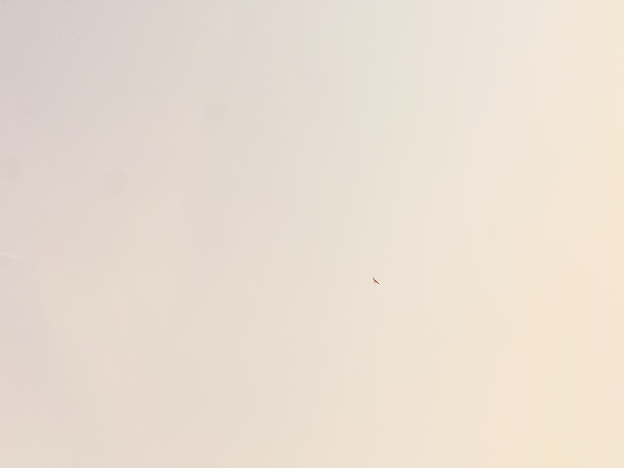 A pale sky fills the frame. A bird flies toward the center of the shot. The location cannot be determined from the image.