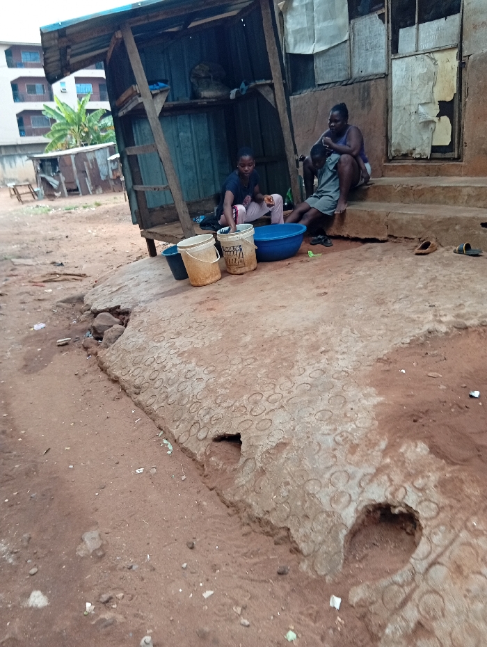 The scene depicts an outdoor domestic setting in Ogidi, Nigeria, featuring three individuals, multiple structures, and unpaved terrain. In the foreground, reddish-brown dirt occupies the lower left, transitioning to a light grey concrete patch in the center with a repeating embossed circular pattern. This concrete exhibits erosion, forming two distinct circular depressions. Small pieces of paper and debris are scattered on the dirt. Three individuals are positioned in the mid-ground. On the left, an adult female with dark hair, wearing a dark short-sleeved top and light-colored pants, sits on a wooden platform under a makeshift corrugated metal lean-to structure. She is leaning forward, her hands near a blue plastic basin and two off-white plastic buckets (one marked "Orijin") on the ground in front of her. To her right, a second adult female, also with dark hair, wearing a dark top and shorts, sits on a concrete step. A child, wearing a light-colored t-shirt and dark shorts, sits between the legs of the second adult female, facing away from the camera. The second adult female appears to be tending to the child. Two pairs of worn sandals rest on the concrete steps near the seated individuals. The immediate background features several structures. The corrugated metal lean-to, constructed with rough wooden supports, shelters the first adult female. Adjacent to this, on the right, is a rustic building with light brown walls and a doorway covered by a tattered light-colored fabric or paper. Further in the background, to the left, is a smaller, dilapidated shack made of corrugated metal and wood, with banana trees nearby. In the distant left background, a multi-story white building with dark windows is visible.