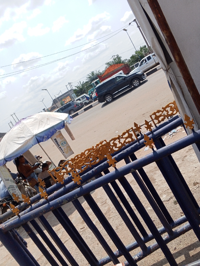 The image depicts a street scene in the city of Naze, Nigeria, captured from a slightly elevated and angled perspective. In the immediate foreground, a dark blue metal fence with ornate, gold-painted decorative elements spans the lower portion of the frame. Beyond the fence, a light brown dirt or sandy ground transitions to a paved asphalt road. In the midground, to the left, several individuals are gathered under a white and blue umbrella. One person, wearing a brown garment, is visible near a motorcycle. A sign displaying "AVAILABLE" is partially legible, hanging from the umbrella's frame. On the road, traffic is moving; a dark-colored SUV (likely black or dark grey) proceeds leftward, followed by a white pickup truck. Further down the road, a large truck carrying a reddish-orange load is visible, along with additional vehicles including another dark SUV and a white van. Utility poles with streetlights and overhead power lines line the thoroughfare. The background features various buildings, suggesting commercial or residential structures, interspersed with green vegetation, including palm trees. The sky is bright with scattered white clouds, indicating daylight conditions.