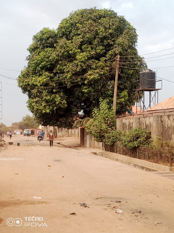 A sun-drenched dirt road stretches into the distance, lined by walls, utility poles, and a water tank. A large tree dominates the scene. A man walks along the road, and a motorcycle approaches from behind. Cars are visible further down the road. Trash litters the road.