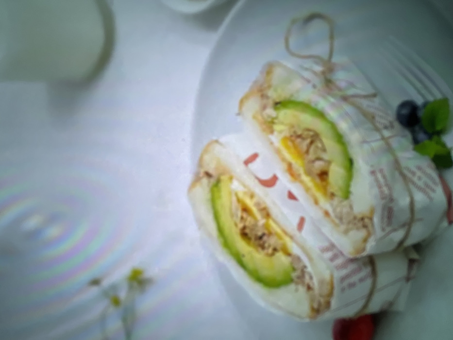 A close-up captures a sandwich cut in half and stacked on a white plate. The sandwich is wrapped in patterned paper and secured with twine. The cross-section reveals avocado, egg, and tuna filling between slices of white bread. A few blueberries and green leaves garnish the plate near the sandwich. A fork is subtly visible next to the sandwich, and a blurry white object is present in the background.