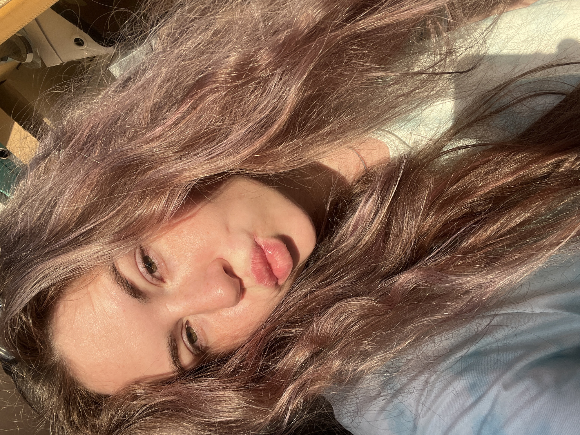 A young woman with long, light brown hair with pink highlights is lying down. Her face is slightly angled to the camera, with her eyes open and lips pursed. The background appears to be a light blue surface, possibly bedding or clothing. In the upper left corner, there is a glimpse of a wooden structure or piece of furniture, and a white appliance that looks like a sewing machine. The scene is illuminated by natural sunlight, creating shadows across the woman's face and hair. There is no clear evidence of location in Chaikovsky, Russia.