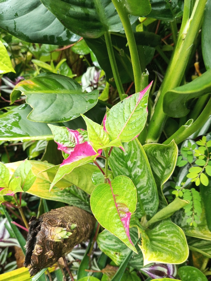 A cluster of green plants, vibrant with unique textures and colors, fills the frame. Prominently featured is a plant with light green leaves edged in bright pink. Nearby, a tuberous root sprouts new growth, adding an earthy element. Variegated leaves with purple stripes provide additional visual interest. Larger, glossy green leaves act as a backdrop, creating a lush, layered effect. A smattering of tiny green leaves completes this diverse and healthy botanical composition.