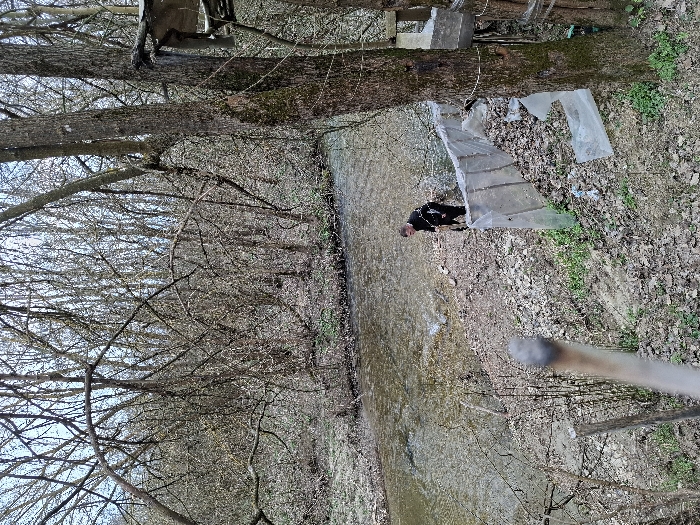 The scene depicts a riparian area within the city of Strazhitsa, Bulgaria, during late winter or early spring. A narrow, shallow river flows from the background through the center of the image towards the foreground, its surface reflecting the sky and surrounding trees. The riverbanks consist of uneven terrain, composed of soil, pebbles, and sparse patches of green vegetation, intermixed with dried leaves. The environment is heavily wooded with deciduous trees, characterized by numerous bare branches and visible light-colored buds, consistent with the transition period between winter and spring. The trees form a dense, intricate canopy and a thick background. In the lower-middle section of the image, on the right bank of the river, a single adult male is observed. He is wearing dark clothing, possibly a black long-sleeved shirt or jacket and dark trousers. The male subject is positioned facing the river, with his torso slightly turned away from the camera and his head turned to the left. His right arm is extended downwards towards the water or riverbank, indicating an engagement with the immediate environment. The specific action is not clearly discernible. On the right bank, closer to the foreground, a section of discarded, translucent corrugated plastic sheeting lies partially collapsed and intermingled with ground debris. Further right, attached to the trunk of a large tree, are rudimentary wooden structures, appearing to be a makeshift platform or shelter, secured with visible wire or rope. In the blurred foreground, center-left, an upright wooden stake or branch is partially visible. The lighting is diffused, suggesting an overcast day.