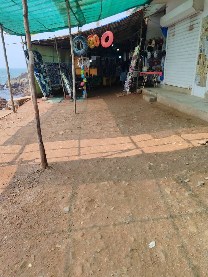 The image presents an outdoor market scene located in Querim, India, adjacent to a coastline. The foreground consists of dry, reddish-brown earth mixed with small stones, showing defined shadows from an unseen overhead structure. To the immediate left, a body of water, consistent with the Arabian Sea, meets a rocky shore under a clear sky. In the midground, a series of makeshift market stalls are constructed. These stalls utilize rough wooden poles as supports for a green mesh or tarpaulin canopy. The leftmost stall displays multiple items, predominantly appearing as swimwear and flip-flops, arranged vertically on racks. The central section of the stalls features hanging merchandise including a gray wheel or tire, three distinct orange circular flotation devices, and colorful plastic items resembling keychains or small toys. Inside this central stall, a solitary, indistinct human figure is visible, seemingly seated or standing in a dimly lit interior. To the right of the temporary market stalls, a permanent white building with a raised concrete walkway is present. This structure features a closed metal roller shutter door. The wall to the right of the shutter is covered with numerous affixed papers or posters. A small red folding table, displaying several hats or caps, stands between the temporary stalls and the permanent building. No specific actions or interactions are discernible among any individuals.