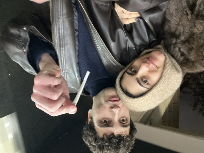 Two people pose for a selfie. The person on the left, presumably male, has curly hair and holds a rolled cigarette between their fingers. They wear a blue sweater and a leather jacket. The person on the right, presumably female, wears a tan-colored hooded garment and a brown furry jacket. The image is slightly rotated, with the subjects appearing sideways. A window or wall is visible in the background.