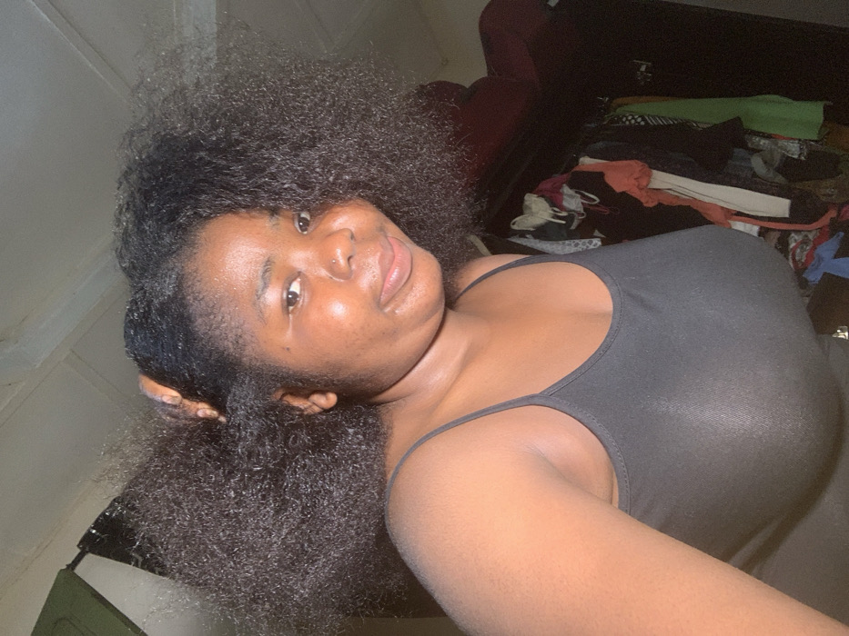 A young woman with dark skin and a nose piercing looks at the camera. Her hair is long and curly. She wears a black tank top. In the background are clothes piled on top of luggage, along with a red chair and part of a green object near the wall. The room is sparsely lit.
