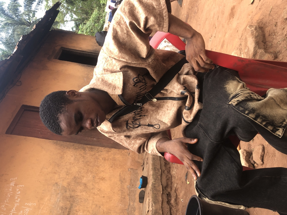 In Eziudo, Nigeria, an outdoor scene depicts a young male subject seated on a red plastic chair