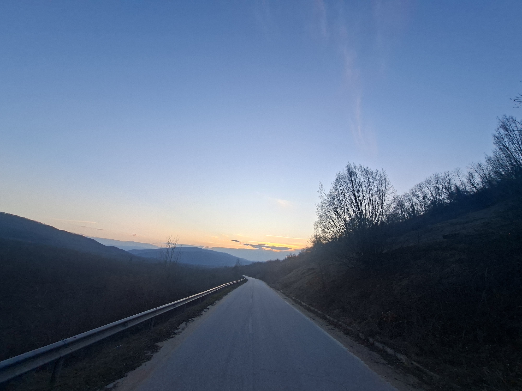 A paved road, presumed to be near Balgarene, Bulgaria, extends into the distance under conditions consistent with sunset. The asphalt road features a faded white center line visible in segments. A metal guardrail is positioned along the left shoulder of the road, paralleling the roadway. To the left of the guardrail, a slope with sparse, dark vegetation leads to multiple layers of distant mountains, appearing in various shades of blue and gray. The sky transitions from a deep blue overhead to lighter blue, yellow, and orange tones near the horizon, where the sun is setting or has recently set. A faint, linear cloud formation is present in the upper right quadrant of the sky. On the right side of the road, a steep embankment is densely covered with dormant deciduous trees and shrubs, casting dark silhouettes against the ambient light. No individuals, vehicles, animals, or active interactions are visible.