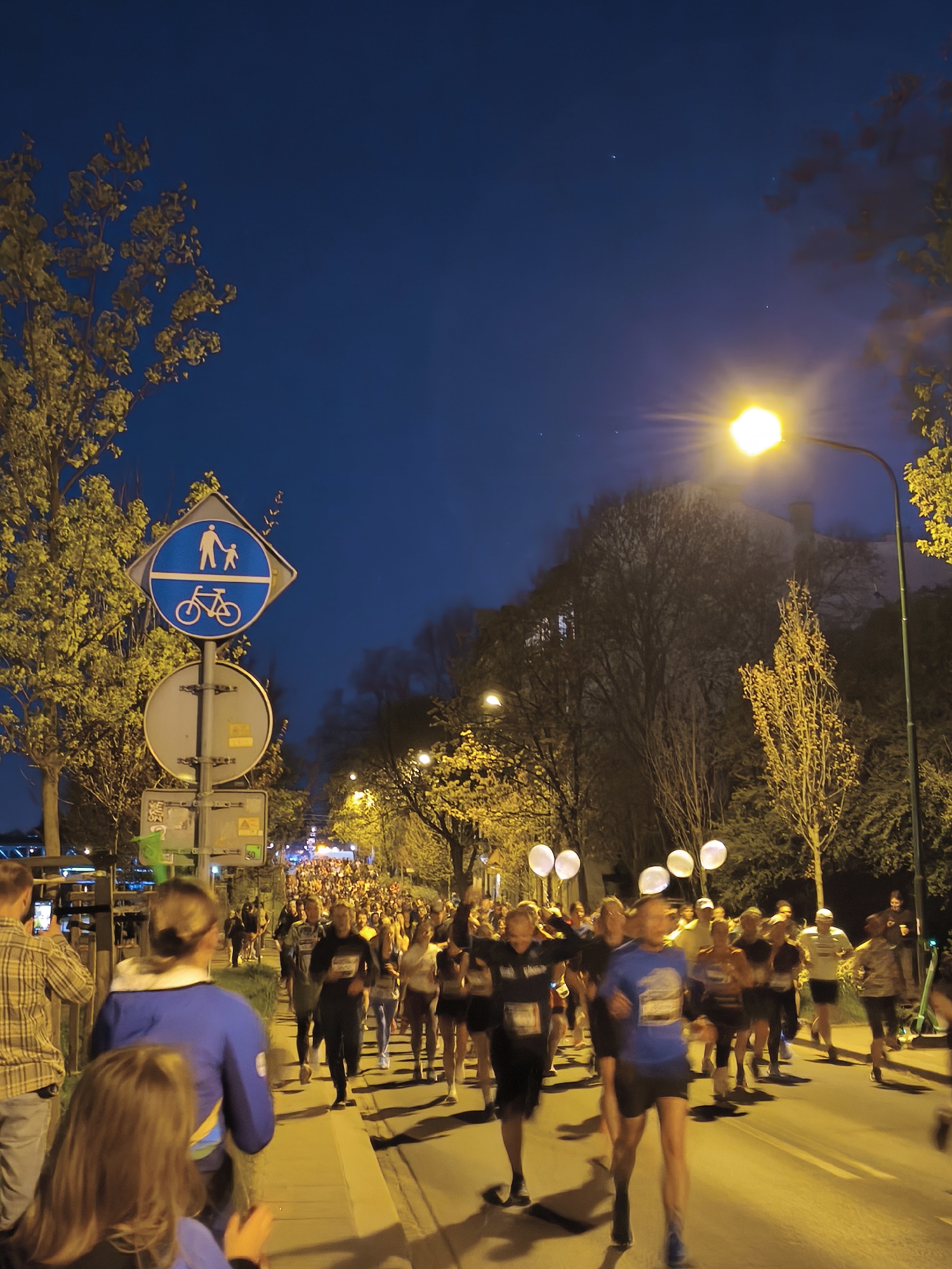 A nighttime view depicts a throng of people participating in a run or marathon in Krakow, Poland. Runners are illuminated by overhead streetlights. The route is lined with trees that show autumnal coloring. A sign for a pedestrian and bicycle lane is prominently displayed. Spectators stand on the sidewalk, some capturing the event with their mobile devices.