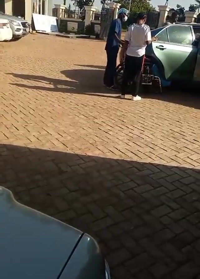 parking area paved with brick. A light blue car is parked in the foreground. In the midground, two people are assisting someone in a wheelchair to get into a light blue car. One person is wearing a white shirt and black pants. The other person is wearing a blue shirt and black pants. There are other parked cars, a building, and trees visible in the background. The sky is clear and the sun is shining.