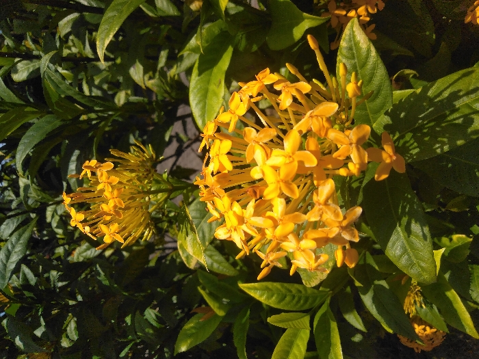 This image captures a close-up of a flowering plant in Phouviang-Gnai, Laos. The central subject is a vibrant cluster of bright yellow Ixora flowers, characterized by multiple small, four-petaled blooms forming a dense spherical inflorescence. A second, partially bloomed cluster of similar yellow flowers and buds is visible towards the top-center. The flowers are set against a backdrop of deep green, ovate leaves, some exhibiting lighter green coloration or subtle veining. Direct sunlight illuminates the scene, casting defined shadows across the foliage, indicative of an outdoor, daytime environment. No individuals, animals, or artificial structures are discernible within the frame.