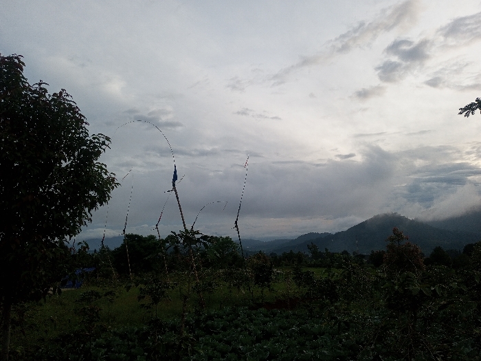 A rural scene with a lush foreground of dark green vegetation. Thin, tall poles rise from the ground, some with small flags attached. In the background, rolling hills are partially obscured by mist and low-hanging clouds. The sky is overcast, filled with gray clouds and hints of sunlight breaking through. A large tree with dense foliage is on the left, framing the view. The overall atmosphere is tranquil and somewhat muted.
