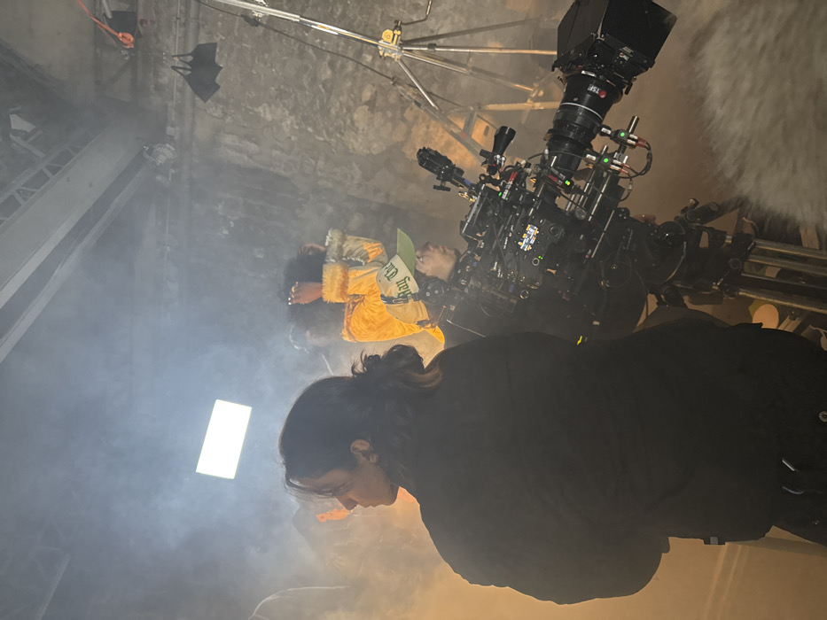 A film set features a large professional camera rig dominating the scene. Two individuals lie on the ground in front of the camera, one in a yellow outfit and cap. A woman with long dark hair in a black coat appears to be working, facing downwards. Artificial smoke or fog fills the room. A light panel is visible on the left, and rigging can be seen at the top. The overall impression is a behind-the-scenes look at a film production.