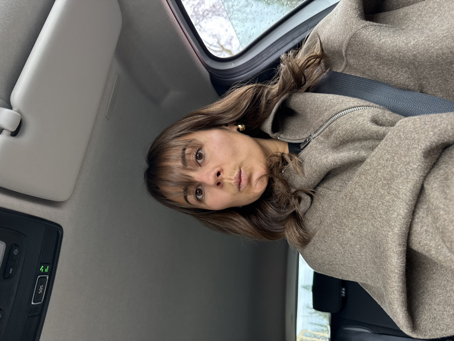 A female individual is seated inside a vehicle, located in the city of Mougins, France. She is positioned centrally, looking directly at the camera with her lips pursed forward. She has brown hair with bangs and wears a textured, light brown or taupe-colored coat featuring a silver zipper, with a black garment visible underneath. A black seatbelt crosses her right shoulder and chest. A gold-colored hoop earring is visible on her right ear. Above her, the vehicle's overhead console includes an "SOS" button and a green illuminated indicator light. A light-colored sun visor is partially visible on the upper right side of the frame. The exterior through the vehicle's windows shows ambient daylight, with visible moisture, consistent with rain, on the glass to the right.