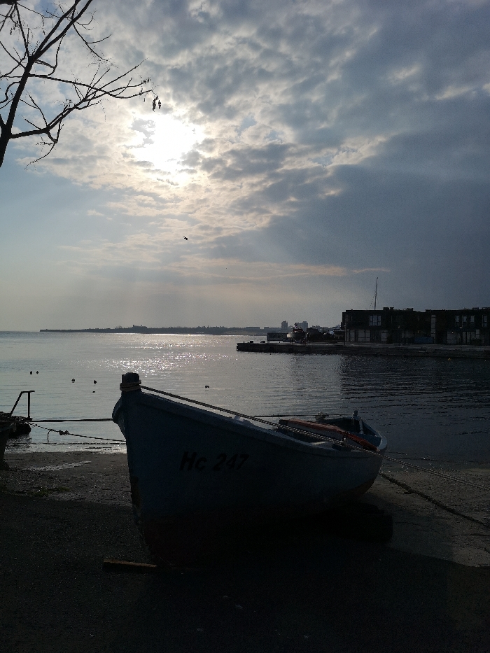 The image depicts a coastal scene in Nesebar, Bulgaria, under a partially cloudy sky with strong backlighting. A light blue wooden fishing boat, marked "Hc 247" in red on its bow, rests on a gravelly concrete shore in the foreground, largely in silhouette. Ropes are visible extending from the boat's bow. To the upper left, a bare tree branch is silhouetted against the bright sky. The sea or bay in the midground is calm, reflecting sunlight in a shimmering path extending from the horizon towards the viewer. Several small, dark objects float in the water near the left shore. In the background, a distant landmass or city skyline is visible across the water. To the right, a pier extends into the water, beyond which a modern, multi-story building complex with dark facades and multiple windows is present. A sailboat mast is discernible behind this structure. The sky is characterized by a blend of bright, sun-illuminated clouds in the upper left and darker, heavier clouds towards the right. The sun is visible through a break in the clouds, casting rays of light. A single dark bird is captured in flight in the mid-sky. No individuals are present.