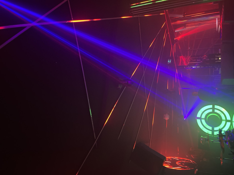 A dimly lit room is illuminated by a complex network of blue and red laser beams that crisscross the space. Thin white lines suggest additional light structures. On the right side, a circular green light display with concentric rings stands out. A speaker and a partially visible patterned platform are in the foreground. The upper background reveals a structure with more lighting elements. The overall ambiance is that of a nightclub or entertainment venue.