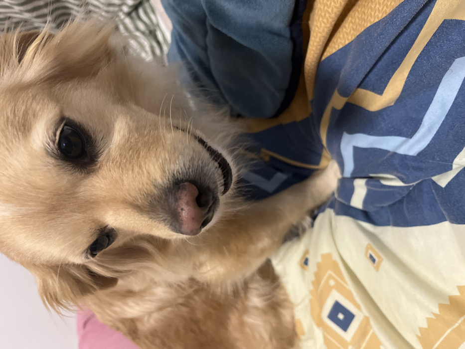 The scene is an indoor setting within the city of Varna, Bulgaria. A light brown to golden-furred dog, consistent with a small to medium mixed breed, is depicted in a close-up, chest-up view, positioned centrally in the frame. The dog has dark brown eyes, a pinkish-brown nose with visible pores, and its mouth is slightly ajar, revealing lower teeth and a small portion of its tongue. Its gaze is directed downward and slightly to its right. The dog is resting on a patterned bedspread or blanket. The left portion of the bedding features a light cream background adorned with blue and orange geometric, possibly diamond-shaped, patterns. The right portion of the bedding is dark blue with light blue and beige striped or chevron-like patterns. In the upper left background, a solid pink surface is visible, likely a pillow or wall. The upper right background displays a striped fabric, possibly greenish-white and a darker shade of green, and a folded teal blue blanket or fabric. No people are visible in the image.