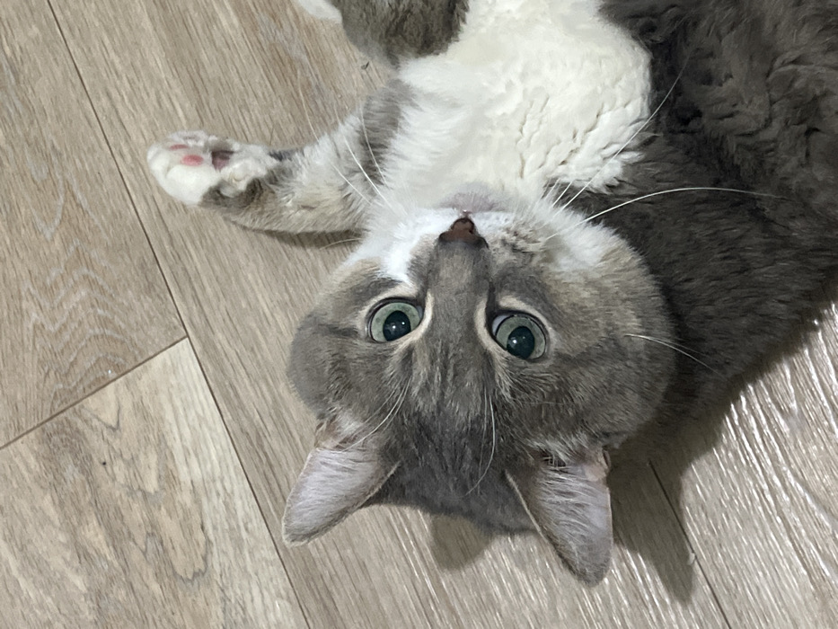 A gray and white cat lies on its back on a light-colored wooden floor. The cat's face is upside down, with large, inquisitive green eyes focused directly on the camera. One front paw is extended, showing small pink paw pads. The cat's fur is a mix of short gray and fluffy white, giving it a soft appearance. Whiskers are prominent. The overall impression is one of playful curiosity.